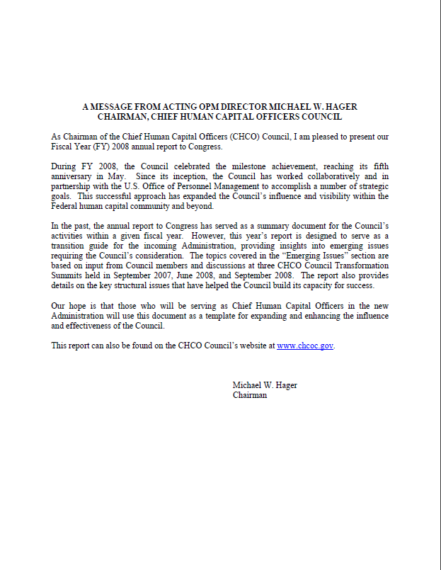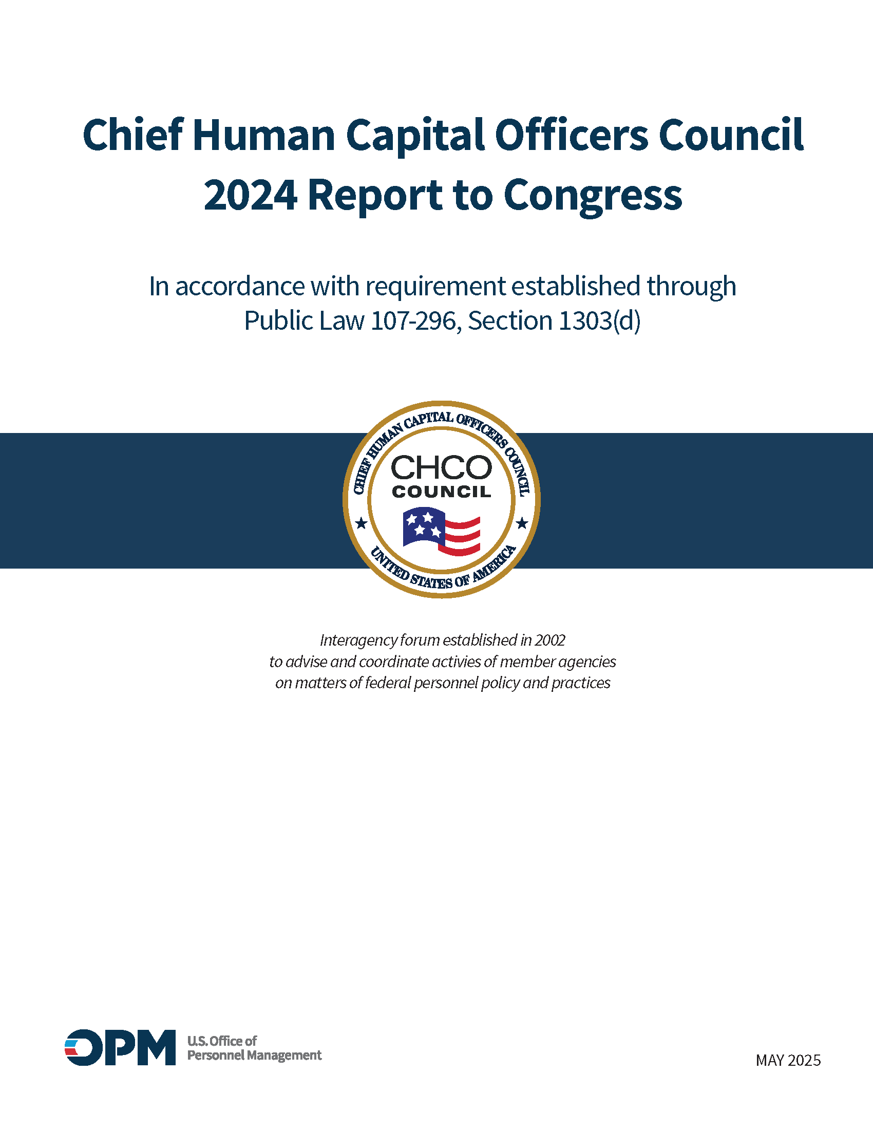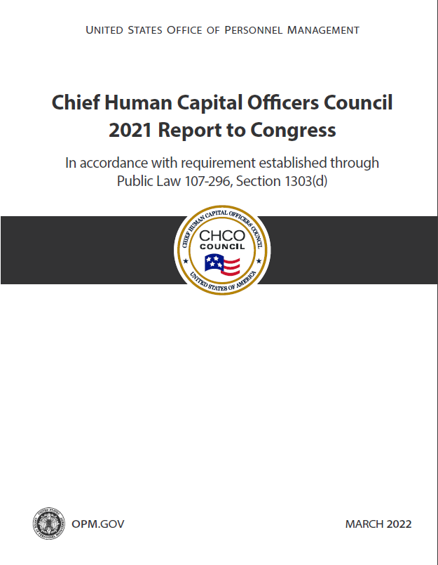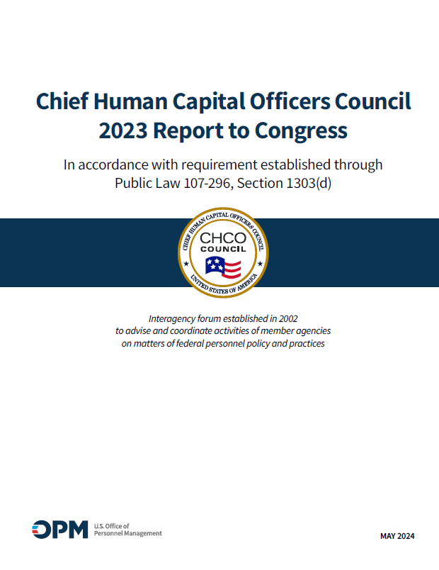 The Chief Human Capital Officers (CHCO) Council submits an Annual Report to Congress as required by the Homeland Security Act of 2002. These reports highlight the Council’s efforts to modernize federal human capital policies, strengthen the workforce, and advance initiatives that support agency missions. Each year’s report reflects progress, priorities, and collaboration across government to ensure a high-performing and skilled federal workforce.